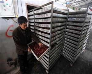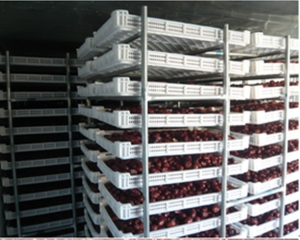 5、裝棗:每平方米烘盤(pán)裝棗量,因不同品種而異。一般為7.5公斤左右,裝棗厚度以2層為宜。小果品種如金絲小棗可適當(dāng)增大裝棗量。