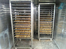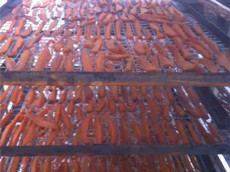 在這些工序完成之后,在將切好的紅薯片放入擺放物料的架子上。做到厚度均勻、擺放整齊。