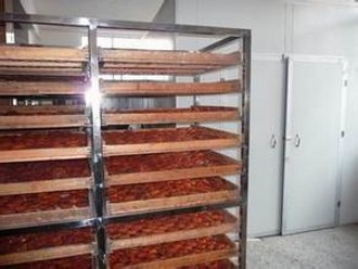 烘烤房中溫度通常保持在50℃左右,最高不得高于55℃ ,操作人員應(yīng)根據(jù)柿子干燥程度隨時(shí)將裝有柿子的烘烤篩調(diào)換位置。 在柿子進(jìn)入烘房干燥10小時(shí)~16小時(shí)后,柿子失去應(yīng)失水分的50%~60%以后,表面開(kāi)始結(jié)皮,顏色由橙黃變得發(fā)白,果肉由硬變得微微發(fā)軟, 可進(jìn)行第一次捏餅。捏餅可加速干燥過(guò)程,并能提高柿餅的質(zhì)量。其方法是:兩手交錯(cuò)握柿,輕輕地橫向捏,邊捏邊轉(zhuǎn),將柿子內(nèi)部的果肉組織捏破成碎塊狀。 捏餅時(shí)千萬(wàn)不要用力過(guò)猛,以避免柿子表皮破損,影響柿餅外觀及耐貯性。 第一次捏餅后,柿子返回烘房繼續(xù)干燥,干燥19小時(shí)~25小時(shí)后, 柿子表皮出現(xiàn)皺紋,可進(jìn)行第二次捏餅,將內(nèi)部硬塊全部擠碎, 使其成為一包漿質(zhì)。有核時(shí)將核推倒,將柿子上下捏成圓餅形。 此次捏餅對(duì)提高柿餅質(zhì)量至關(guān)重要,否則產(chǎn)品干燥不均勻,脫澀不完全,透明度不好,品質(zhì)不佳。 第二次捏餅后,柿子再次置于烘房中進(jìn)一步干燥。 總干燥時(shí)間達(dá)30小時(shí)~36小時(shí)后,柿子表面出現(xiàn)粗大皺紋,進(jìn)行第三次捏餅, 將柿餅進(jìn)一步捏成圓形。 第三次捏餅后,將柿餅返回烘房再烘烤10小時(shí)左右。 當(dāng)含水量為36%~38%時(shí),柿餅里外軟硬一至、富有彈性,即可出烘房,整形、 泠卻后轉(zhuǎn)入堆捂。